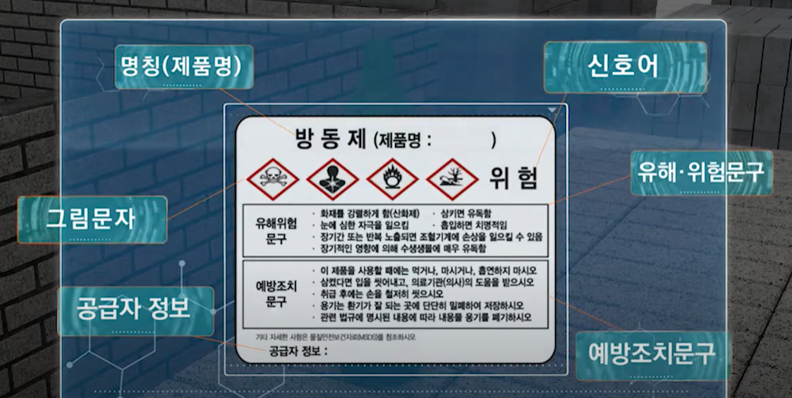 - 상징(Pictogram) : 물질의 위험성을 나타내는 그림. 예를 들어, 불꽃 모양은 인화성을, 해골과 뼈는 독성을 의미합니다.